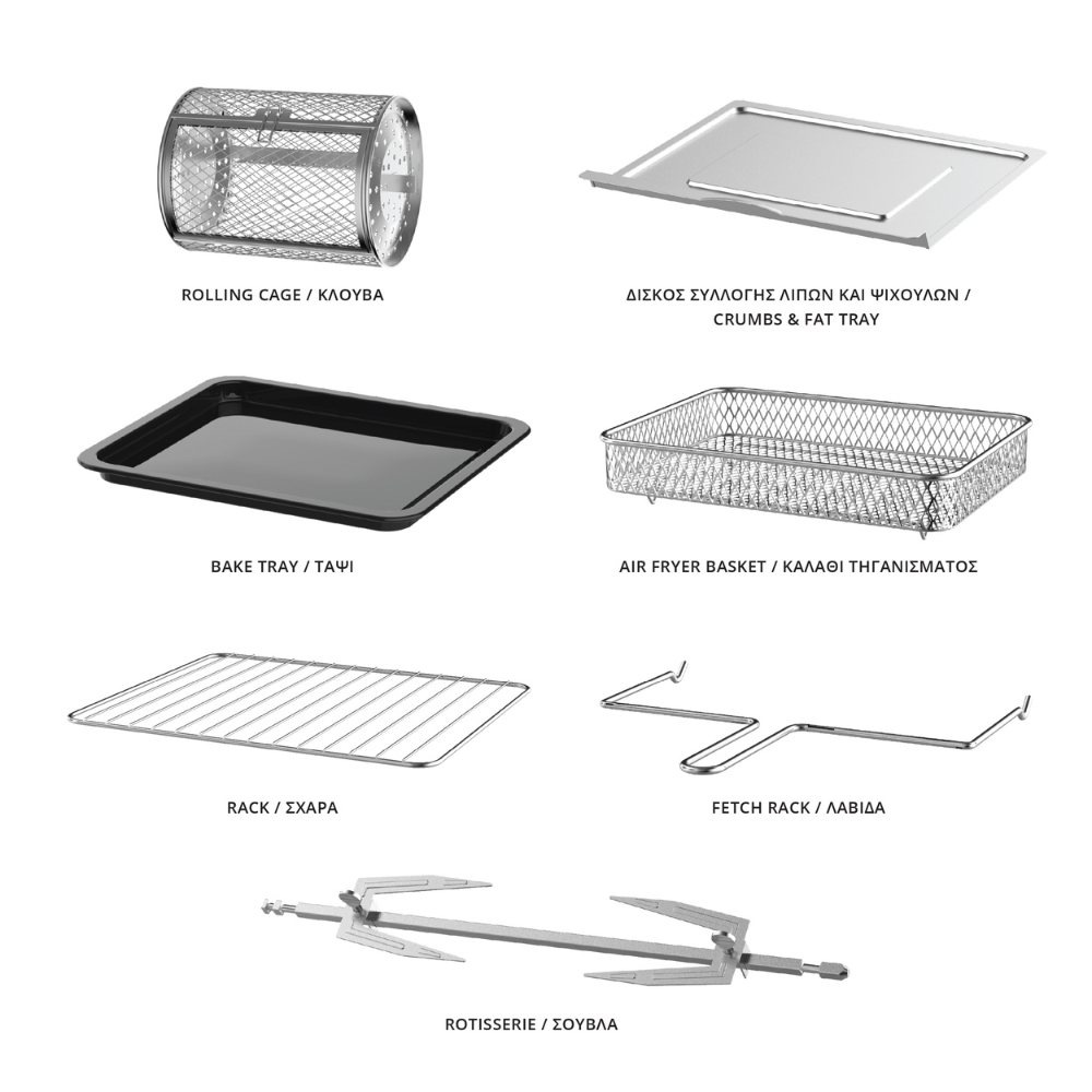 - Περιέχονται: ταψί, καλάθι τηγανίσματος αεροφριτέζες, σχάρα, σούβλα , κλούβα, λαβίδα, περιστρεφόμενο μπάρμπεκιου – rotisserie