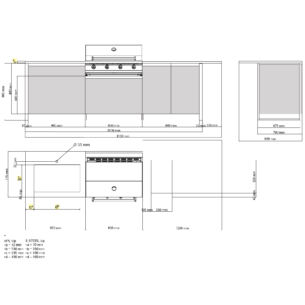 - Πάγκος, εξωτερικές επιφάνειες και ψησταριά κατασκευασμένα από ανοξείδωτο χάλυβα τύπου AISI316-marine grade ο οποίος είναι ανθεκτικός σε θαλάσσιο ή παραθαλάσσιο περιβάλλον!