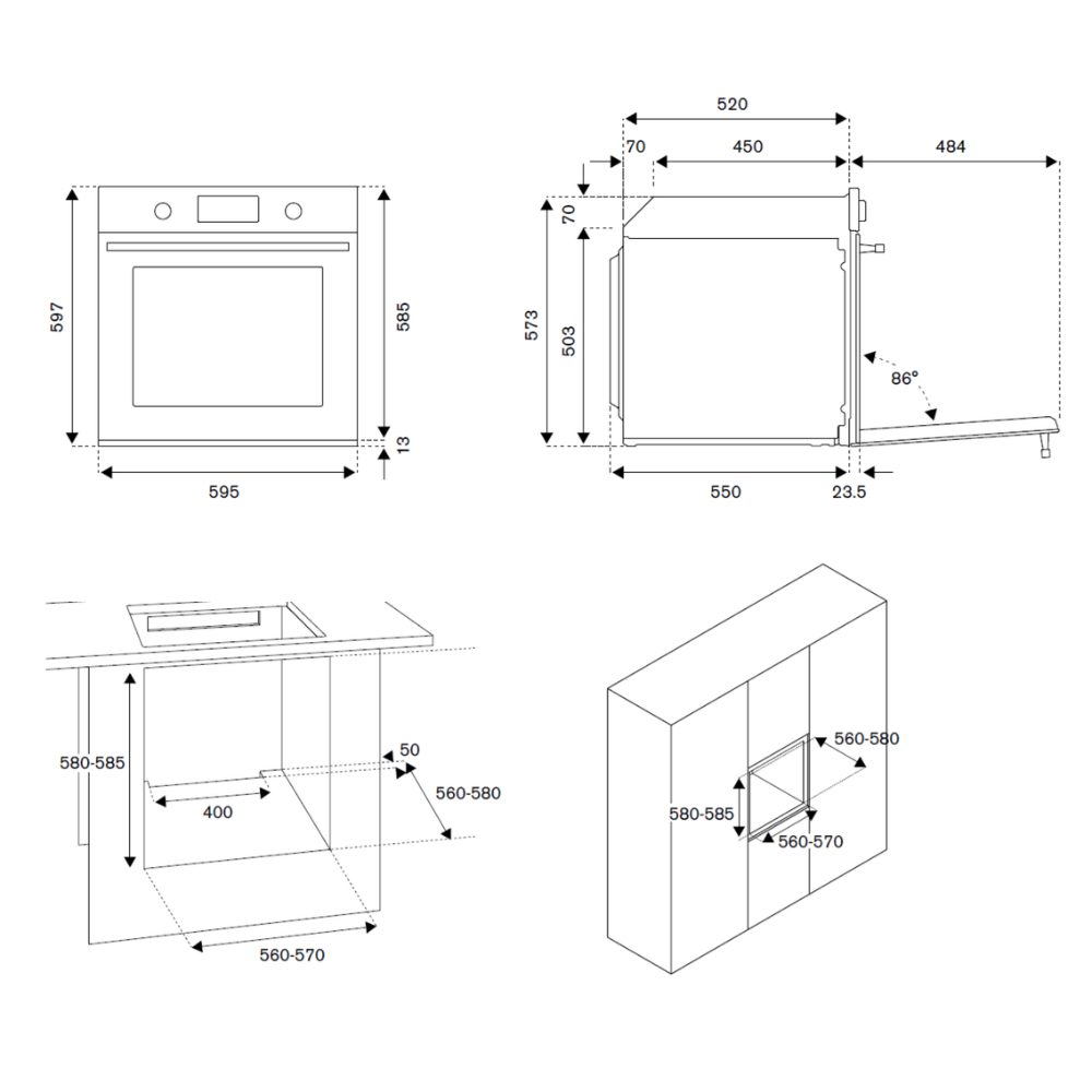 Διαστάσεις εντοιχισμού (ΠxYxB) :56,0-57,0 x 58,0-58,5 x 56,0-58,0 εκ.