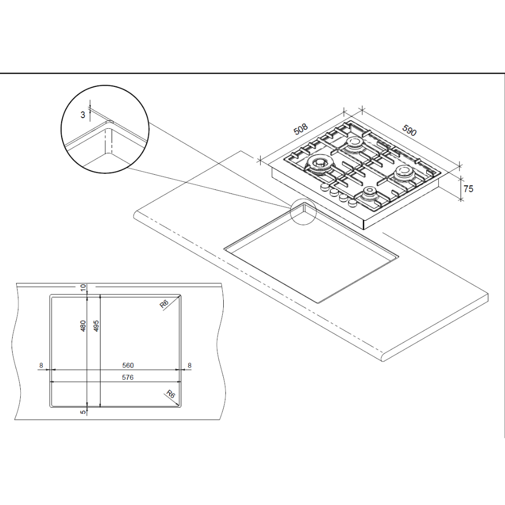 Διαστάσεις κοπής πάγκου (ΠxΒ)560 x 480 χιλ. - 576x495x3 χιλ. η εσοχή για να χωνευτεί