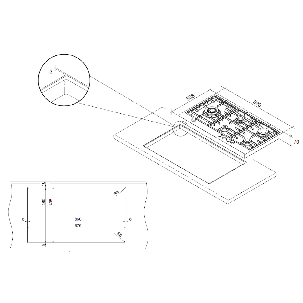 Διαστάσεις κοπής πάγκου (ΠxΒ): 860 x 480 χιλ. - 896x495x3 χιλ. η εσοχή για να χωνευτεί