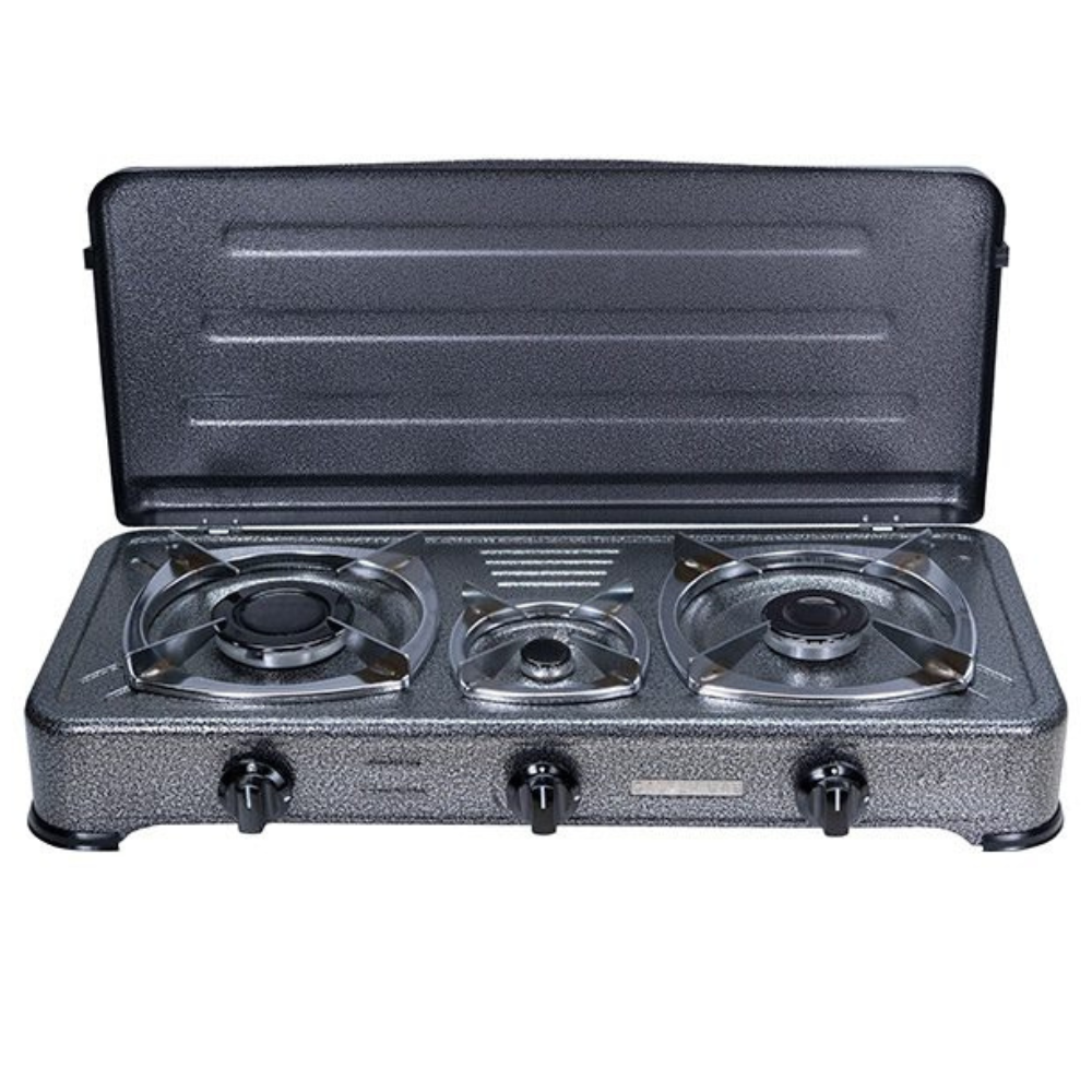 Τρεις εστίες υγραερίου (μεγάλη 1.4Kw-100gr/h, μεσαία 1.1Kw-80gr/h, μικρή 0.2Kw-16gr/h)