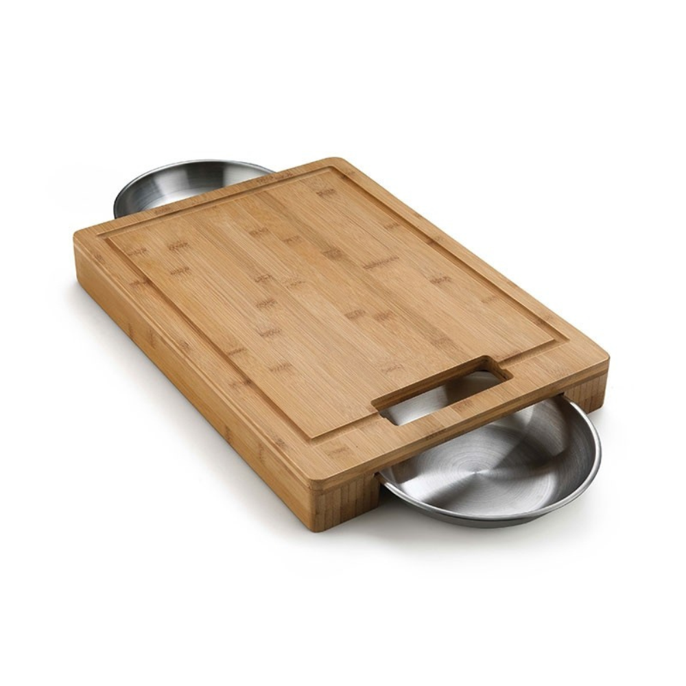 Ο Δίσκος Κοπής με Ανοξείδωτα Μπολ της Napoleon PRO είναι το ιδανικό αξεσουάρ που θα αγαπήσει κάθε ψήστης. Αξιοποιήστε στο έπακρο την ανθεκτική κατασκευή από μπαμπού αλλά και τις ανέσεις που προσφέρει ο εξαιρετικός σχεδιασμός του δίσκου κοπής. Οι ειδικές αυλακώσεις περιμετρικά του δίσκου συλλέγουν τους ζωμούς από τις τροφές κατά το κόψιμο, οι οποίοι καταλήγουν μέσα στον ανοξείδωτο δίσκο, αποφεύγοντας έτσι τον χαμό που δημιουργείται συνήθως κατά την προετοιμασία των φαγητών. Κόψτε τα λαχανικά ή το κρέας σε μερίδες και τοποθετήστε τα κατευθείαν σε ένα από τα δυο ανοξείδωτα μπολ που βρίσκονται στις άκρες του δίσκου. Στις περιπτώσεις που δεν χρειάζεστε τα μπολ, ο μοναδικός σχεδιασμός του δίσκου κοπής σας επιτρέπει να τα “κρύβετε” στις ειδικές εσοχές στο κάτω μέρος του δίσκου.