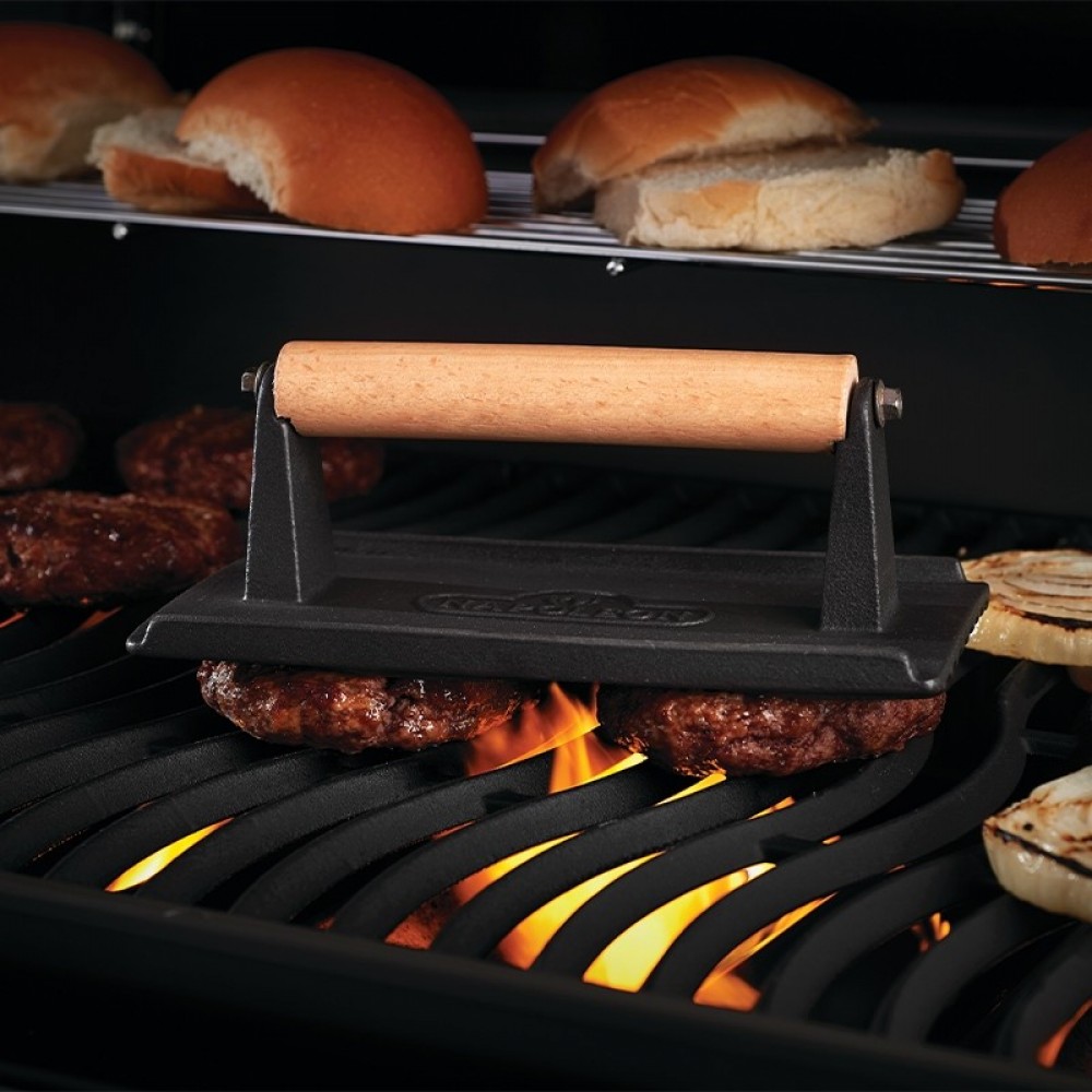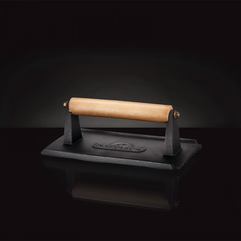 Με την μαντεμένια πρέσα ψησίματος Napoleon (κωδικός 56069) αναβαθμίζετε το ψήσιμο σας ,ενισχύοντας τη γεύση και την υφή των γευμάτων σας. Η βαριά κατασκευή από μαντέμι είναι ιδανική για μαγείρεμα, ενώ η λαβή από ατσάλι με επένδυση ξύλου εξασφαλίζει ασφαλή χρήση .Προθερμάνετε την πρέσα Napoleon ενώ προθερμαίνετε τις σχάρες της ψησταριάς σας για να δημιουργήσετε τα πιο ομοιόμορφα ψημένα μπιφτέκια , το πιο τραγανό μπέικον και άλλα. Τέλος επιταχύνετε την προετοιμασία γευμάτων, ψήνοντας και από τις δύο πλευρές με την πρέσα ψησίματος σαν επαγγελματίας chef.