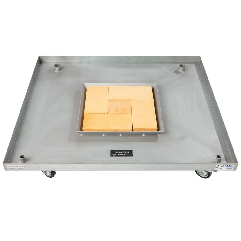 Μεταλλική βάση με πυρότουβλα στο κέντρο για την εστία της φωτιάς και στο χώρο του λιποσυλλέκτη τοποθετείται άμμος ή χώμα με διάσταση 90×90εκ.